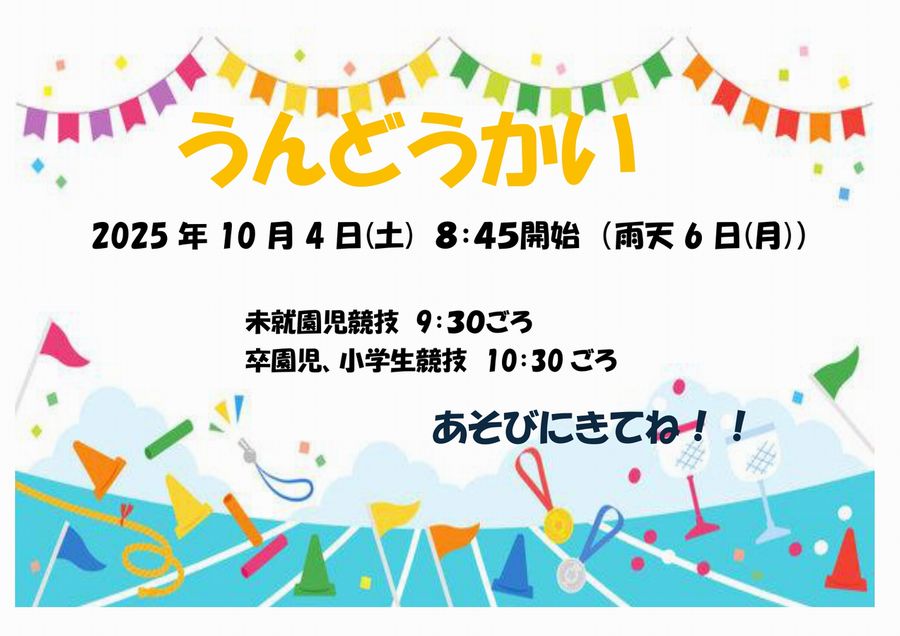 運動会が10月4日(土) 8:45開始。雨天時6日(月) ぜひ遊びに来てくださいね! 未就園児競技 9:30ごろ 卒園児、小学生競技 10:30ごろ...
