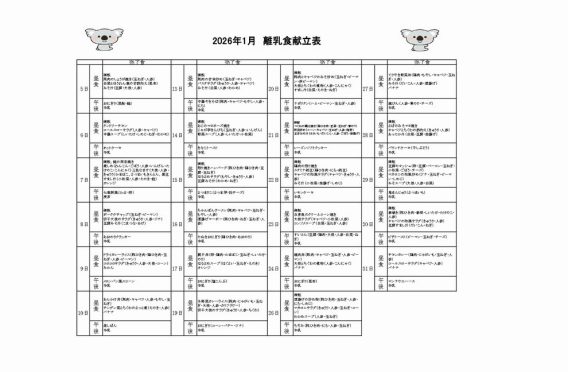 最近のおたより 2025.12.31 1月 献立表 2025.12.31 1月 離乳食献立表 2025.12.1 12月 園だより 2025.12.1 12月 給食だより 2025.11.28 12月 献立表
