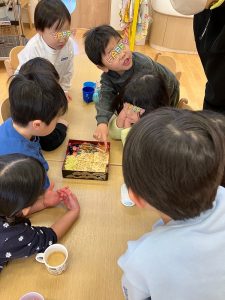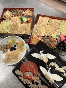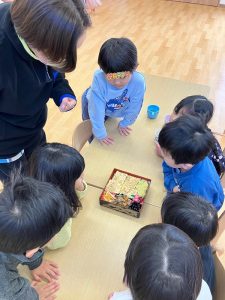 4.5歳は、重箱に入ったおせちを先生に取り分けてもらい食べました!