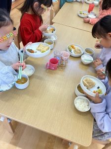 保育はじめ集会でおせちの話を聞き、給食はおせち!