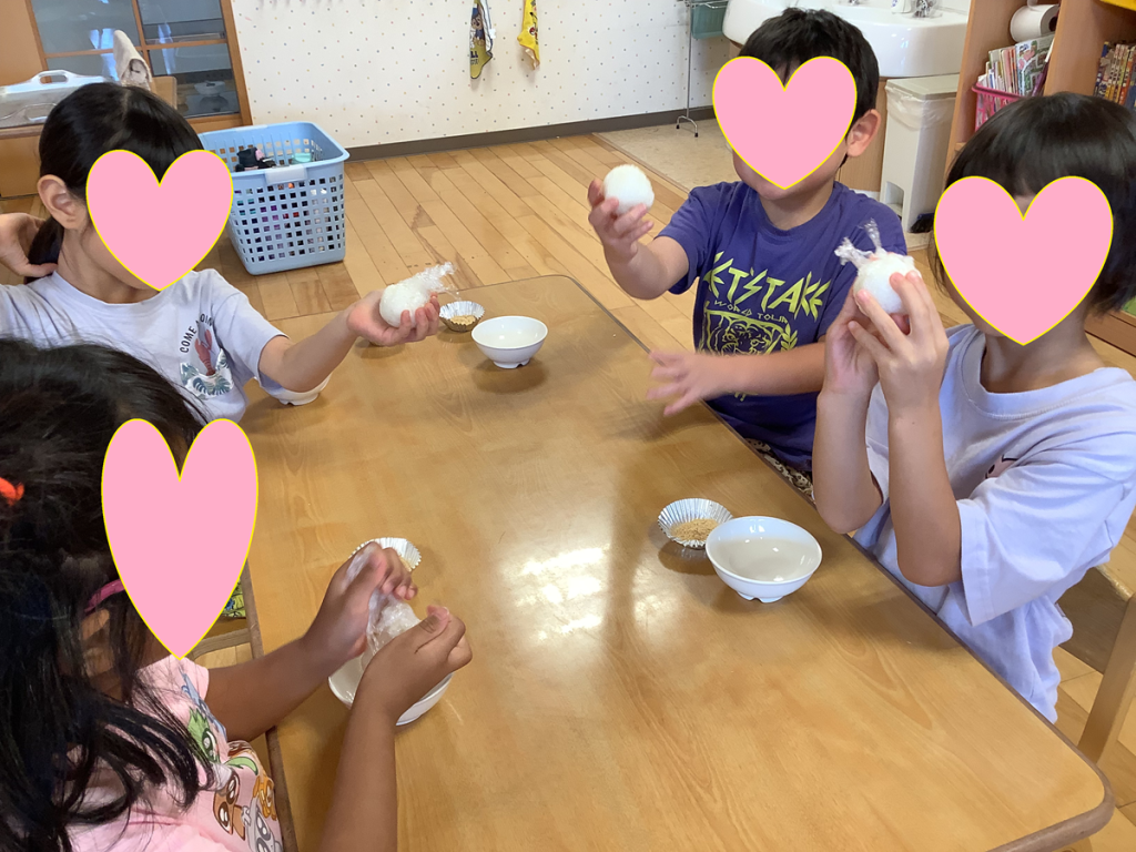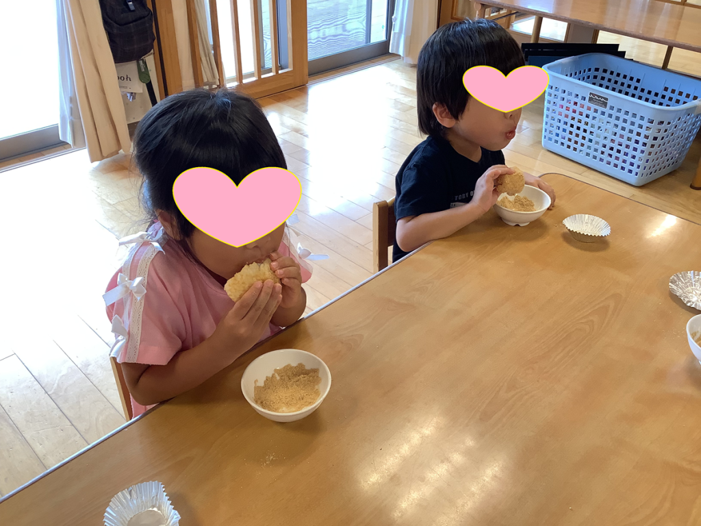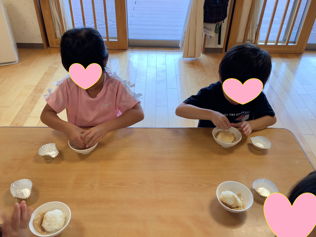 2025.9.26ブログ きな粉おはぎ作り らいおん組🦁 ①ラップに包んだ白米を握る ②きな粉の入っている茶碗の中でおにぎりをコロコロ転がしたり、きな粉をかけたり ③出来立てのきな粉おはぎはおいしいかったです!(^^)! 前の記事 次の記事