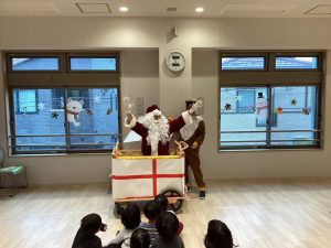 大きなプレゼントの箱の中に入っていたのは… サンタクロース!