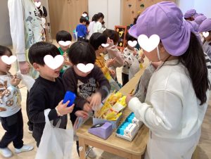2026.1.27ブログ お店屋さんごっこ 「いらっしゃいませ~」と元気いっぱい! 「ぺいぺい」と言いながら、スマホ決済でのお買い物です(^^♪ 買い物を楽しんだ後は、もらったお食事券を調理さんに渡してお給食です♪ 「おいしすぎる~」と大満足の子供たちでした☆彡 前の記事 次の記事